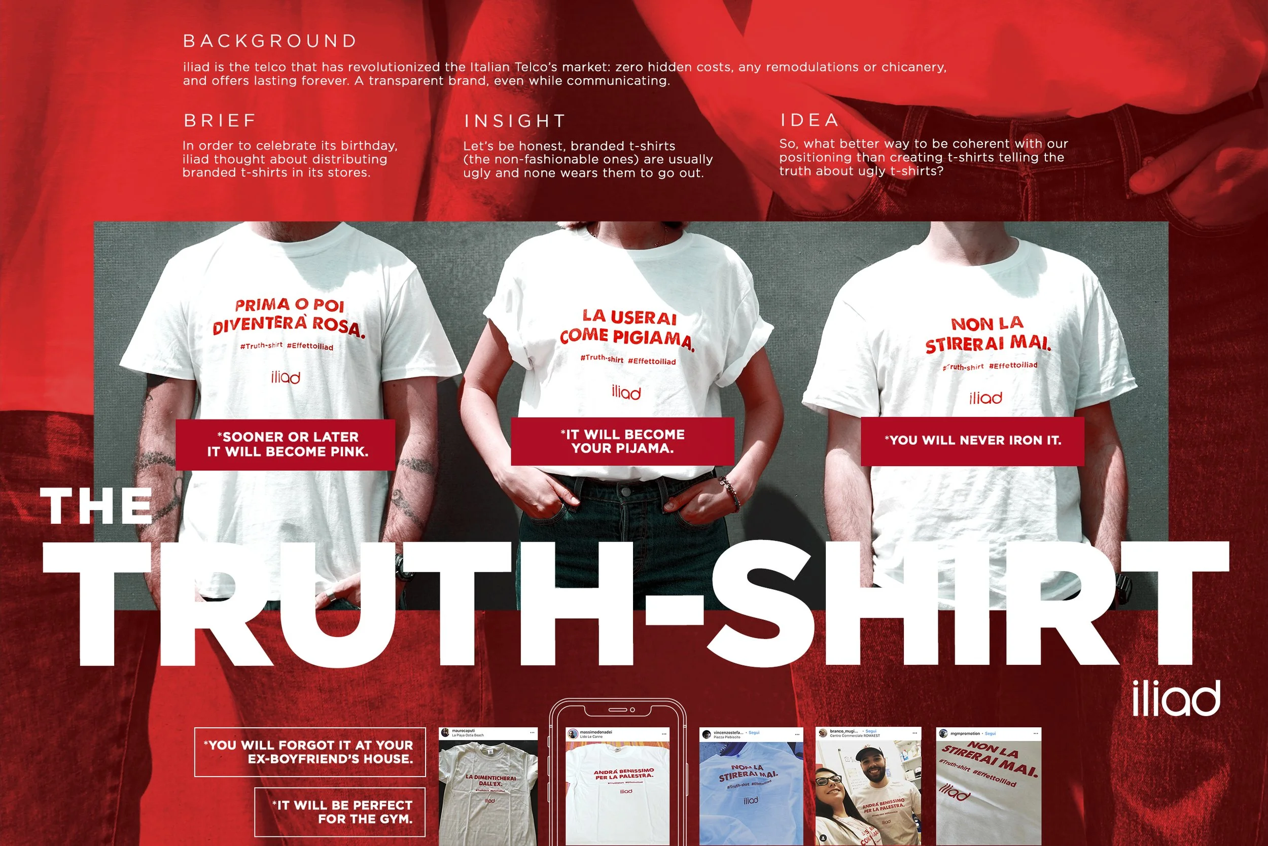 iliad is known in the Italian telecom market as the brand that is always truthful (even when it comes to uncomfortable truths). On the occasion of an event, we were asked to develop a project involving the distribution of branded t-shirts to consumers.
