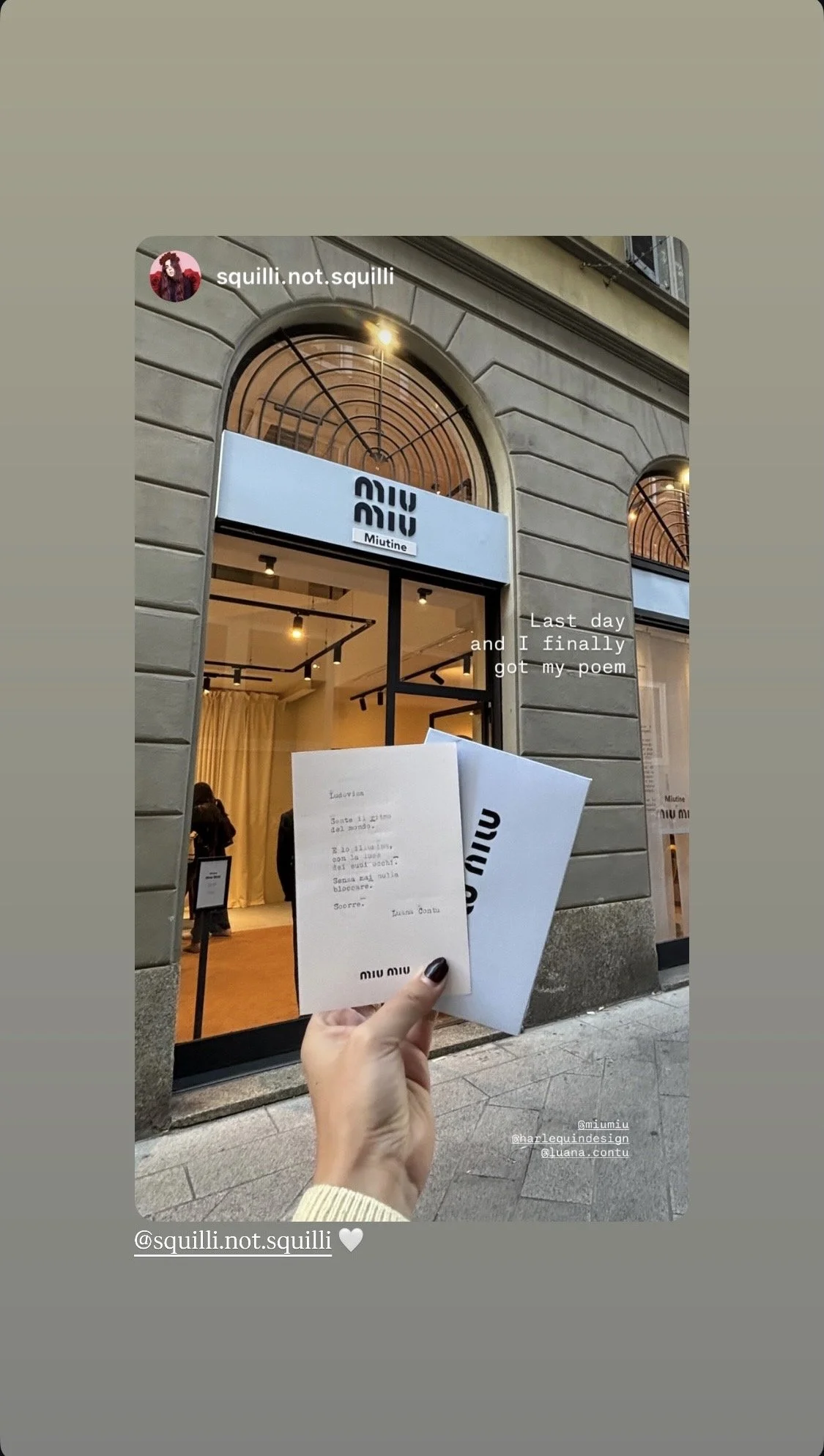This creative brand activation invited guests to experience the poetic side of Miu Miu through a moment of intimacy and imagination. Thousands of visitors took part, sharing their poems and videos on social network, turning the live poetry performance into an organic wave of engagement and visibility for the Miutine launch.